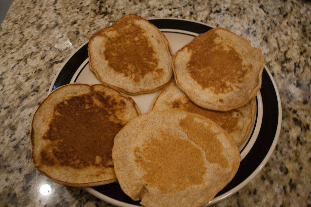 We have a funny way of making pancakes in this house. Namely: we don’t have a big griddle to make them on, so they come off the pan one or two at a time. This leads to eating in the kitchen while waiting for the next one to come off the pan. We’ll also alternate who makes each one so that the other can enjoy theirs while it is hot.