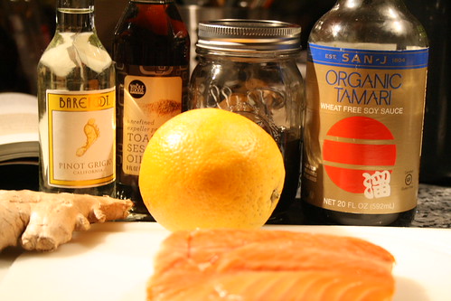 Anyway, of all the edible fishes I’ve had, the various kinds of salmon are my favorites. Of the salmons, I think I like sockeye the best, but they’re all tasty. Luckily for me and my taste buds, Alaskan sockeye salmon has been on “seafoodwatch.org’s”:http://www.seafoodwatch.org “good” or “best choices” “list”:http://www.montereybayaquarium.org/cr/SeafoodWatch/web/sfw_factsheet.aspx?gid=17 for as long as I’ve known about the list. Also lucky for me, I can get it during the late spring at Whole Foods and freeze it for year round. They also freeze it for selling year-round, but recommend against freezing it yourself if you buy outside of the season.h2. Ingredients