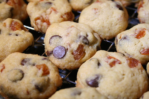 These cookies are all about being a vehicle to transport chocolate & apricot bits from a plate to your mouth. They do this job admirably. You should reward them by eating many of them. Preferably while they are still warm, but not hot, from the oven.