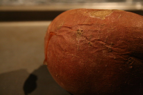 Now, in truth, this is probably not JUST because sweet potatoes leak. However, it turns out they do, so I’m really glad I used a baking pan instead of poking them and throwing them straight on the oven racks, as was my original plan. However, they leak kind of impressively, and they made a hell of a mess of my pan. That probably would have been fine, if a bit annoying. What wasn’t fine was the fact that I made them as a side for a dish-heavy main course, and had no place for the baking pan. So, of course, I stashed it back in the oven. Then forgot about it the next time I preheated the oven, and the caramelized bits of sweet potato attempted to become one with the pan.