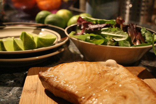 Sustainability, of course, and what that means, is another big topic that I think about (and occasionally write about) when working on this blog. It’s a sticky topic that I don’t have a good handle on, but one I’m also interested in and concerned with. So, it’s definitely exciting to see a favorite fish actually be deemed a good choice by a third party (in this case, Monterrey Bay Aquarium), but it leaves me wondering. That fish had to be brought to me via refrigerated cargo shipping (plane, train, truck, something, since it’s clearly not locally-caught), which I suspect is pretty energy intense. That fish is a high-level predator, of which there are always fewer than lower levels on the food chain; this portion is a big part of why Bill figured he’d never see it considered a “safe eat”. That said, fish is tasty, healthful (I’m told), and a dude with a harpoon may screw up, but he’s going to have a lot less by-catch than a net. In theory, this scales up to a bunch of guys with a bunch of harpoons.