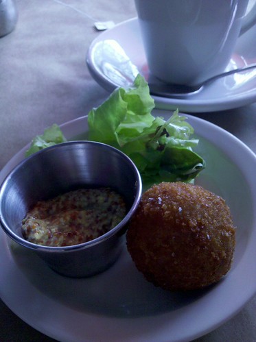 However! We got two extra surprises with our meal. First off, before the meal, we each received a pork bitterbal (“Wikipedia”:https://secure.wikimedia.org/wikipedia/en/wiki/Bitterballen says this is the right way to make bitterballen singular), along with a small pile of greens and some mustard. Tasha really liked hers. I liked mine well enough, but wasn’t nearly as enthusiastic about it as she was. The waitress described the insides of the ball as “like tuna salad, but with pork instead of fish”. I couldn’t place what the greens were dressed with, but it was pretty simple.