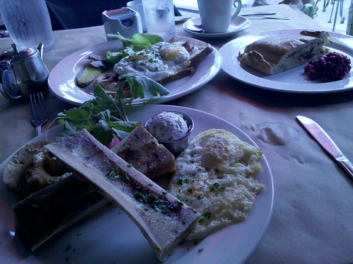 Since I love the guy, I offered Bill the first little taste of everything on my plate. Knowing what eggs taste like, he declined the eggs, but tried everything else. He told me I’d enjoy my meal immensely, though bone marrow wasn’t his thing. He said it was “like meat jelly”.
