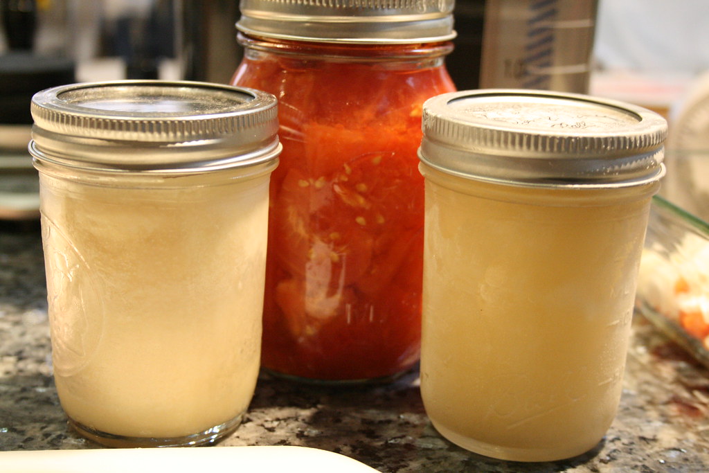 These are three ingredients in tonight’s experiment. Tomatoes I canned myself, earlier this year. Lard I rendered myself, in a slow-cooker. The lard has a bit more of a “pork” smell than I wanted, but I realized for savory applications (especially ones that call for bacon when I’m out of it), this is okay. And, finally, pork stock that my friend David and I made, from our hog.