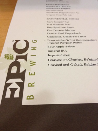 Epic Brewing sells everything they make in bombers. They have a tiny sandwich counter in a room behind the showroom, where you can get a few tasters (two at a time) and a sandwich. It’s clearly a place they installed mostly to give them the ability to sell tasters, but they do a solid sandwich as well. And, frankly? The beer was awesome. Between the two of us we had one ounce pours of their Rio’s Rompin’ Rye, Fest Devious (a märzen), Glutenator (gluten-free), Fermentation Without Representation (a pumpkin imperial porter), Sour Apple Saison, Brainless on Cherries (a Belgian-style golden ale), and Smoked and Oaked (also a Belgian, but no other info).