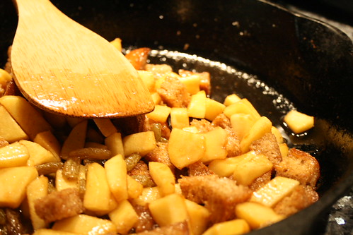 Melt 2 tbsp butter in the skillet you almost roasted your chicken in, because it’s already on the stove. Once the butter’s nice and frothy, throw in the bread cubes and toast them for a few minutes, until they’re nice and browned. Then pull them out & set aside and melt the remaining 1 tbsp butter. Once that’s frothy, throw in the apples, raisins, and sugar. Cook about 4 minutes (crisp-tender?) and then add the rum, if you’re using it, the cinnamon and the vanilla. Sprinkle in a pinch of salt, then mix it all up for a second. Once it’s to your liking, stir in the bread. Get it nice and coated.