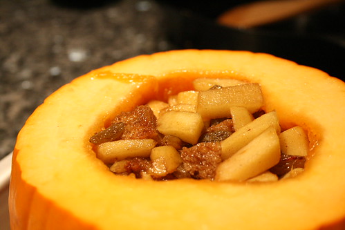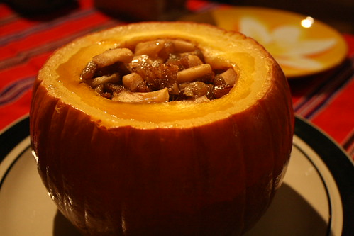 Stuff it all into the middle of the pumpkin. Put the pumpkin in a small baking dish (I used an 8×8 square pan), put in enough boiling water to come about an inch up the sides of the pumpkin. Put the top back on the pumpkin, loosely cover the whole thing with foil (don’t burn yourself), and put it in the oven for about 2 h, or until the pumpkin flesh is soft and wonderful.