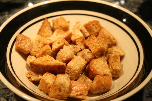 I even had the bread cubes in the freezer, because Bill and I cannot manage a whole loaf of his bread before it goes stale, or a whole loaf of store bread before it goes moldy. So I have lots of bread bits in the freezer. Bill thought this was weird at first, but I didn’t care. I had bread cubes!