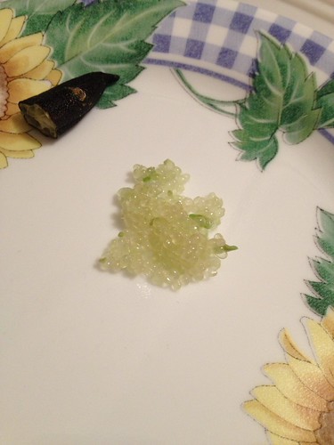 Rather, there are “normal” segments, holding these caviar bits. I know, because Bill thought maybe he could supreme the finger lime half to neat effect, but it didn’t work out well. He gave up and went for squeezing his half too.