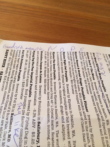 The event was actually a tasting of “Autumn Flavors” at Hudson Street Stackhouse. This is not a bar that is screwing around. I was pretty intent on trying many beers, and they provided. They’ve got 36 taps, and all of them were some variant on an “autumn” beer. I was gleeful when I realized 23 of the taps were PUMPKIN beers. Four were “harvest” beers, and the rest were Oktoberfest beers.