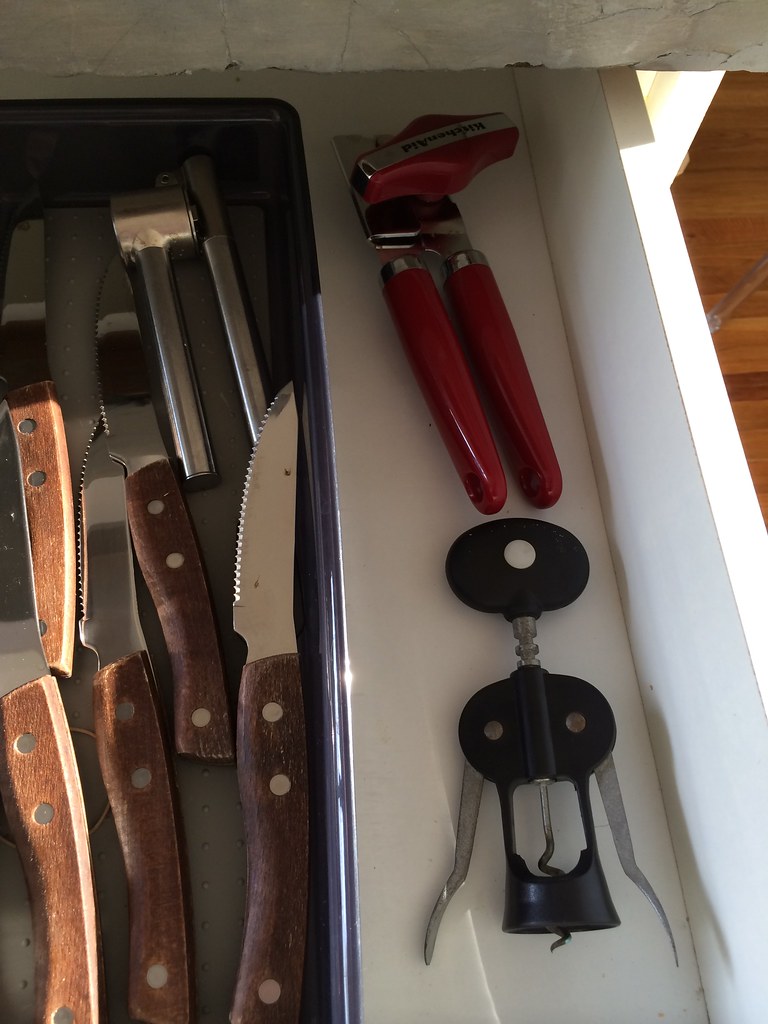 fn2. Including, no joke, a bottle opener. This place doesn’t have one. We had to pull out the multi-tools to open my beer one night. As a beer geek, I made a point of finding a sturdy, but inexpensive, bottle opener and leaving it behind. How is it that they have both a can opener and a corkscrew, two things that often have bottle openers on them, and NEITHER DOES?
