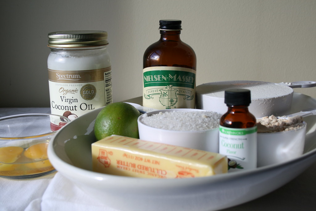 Beat together the egg & egg yolk. Cream together the butter, oil, salt, and sugar. Once they’re thoroughly mixed, stir in the egg mixture, coconut emulsion, and vanilla extract. Once that’s thoroughly mixed, add the lime juice and lime zest. Add the flours and stir until the dough comes together.