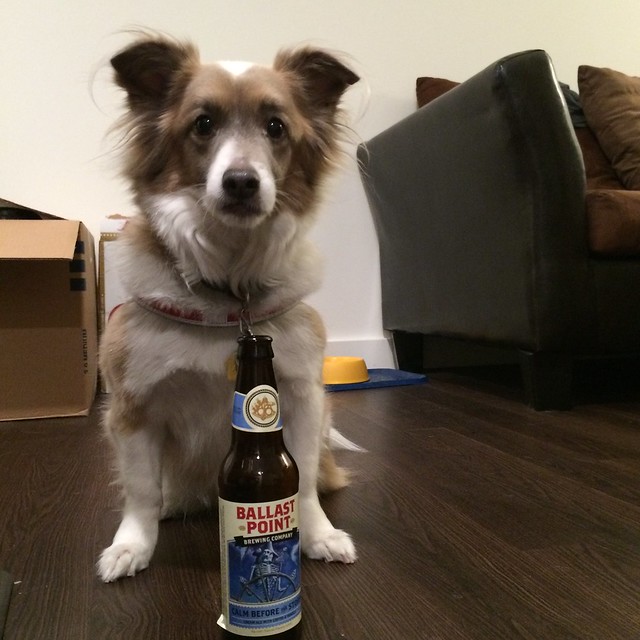 A dog sitting over an open & empty bottle of Ballast Point